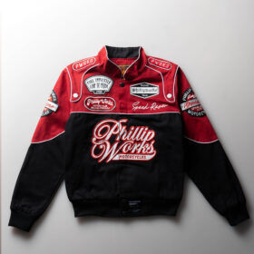 A Heavyweight jacket with original hand drawn patches & embroidery on chest, back and sleeves inspired by the rider jacket.