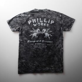 A short sleeve tee with a phillipworks artwork screen printing on chest and back